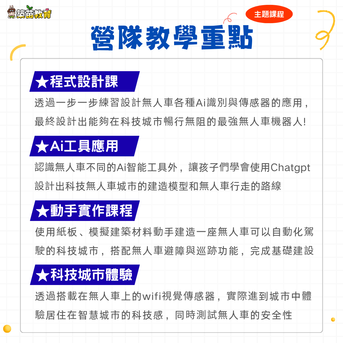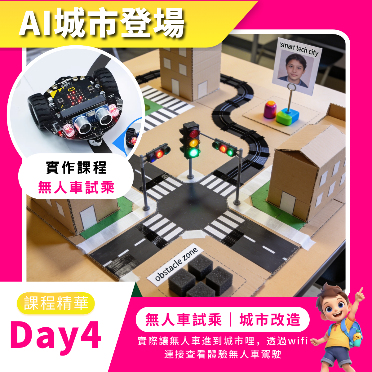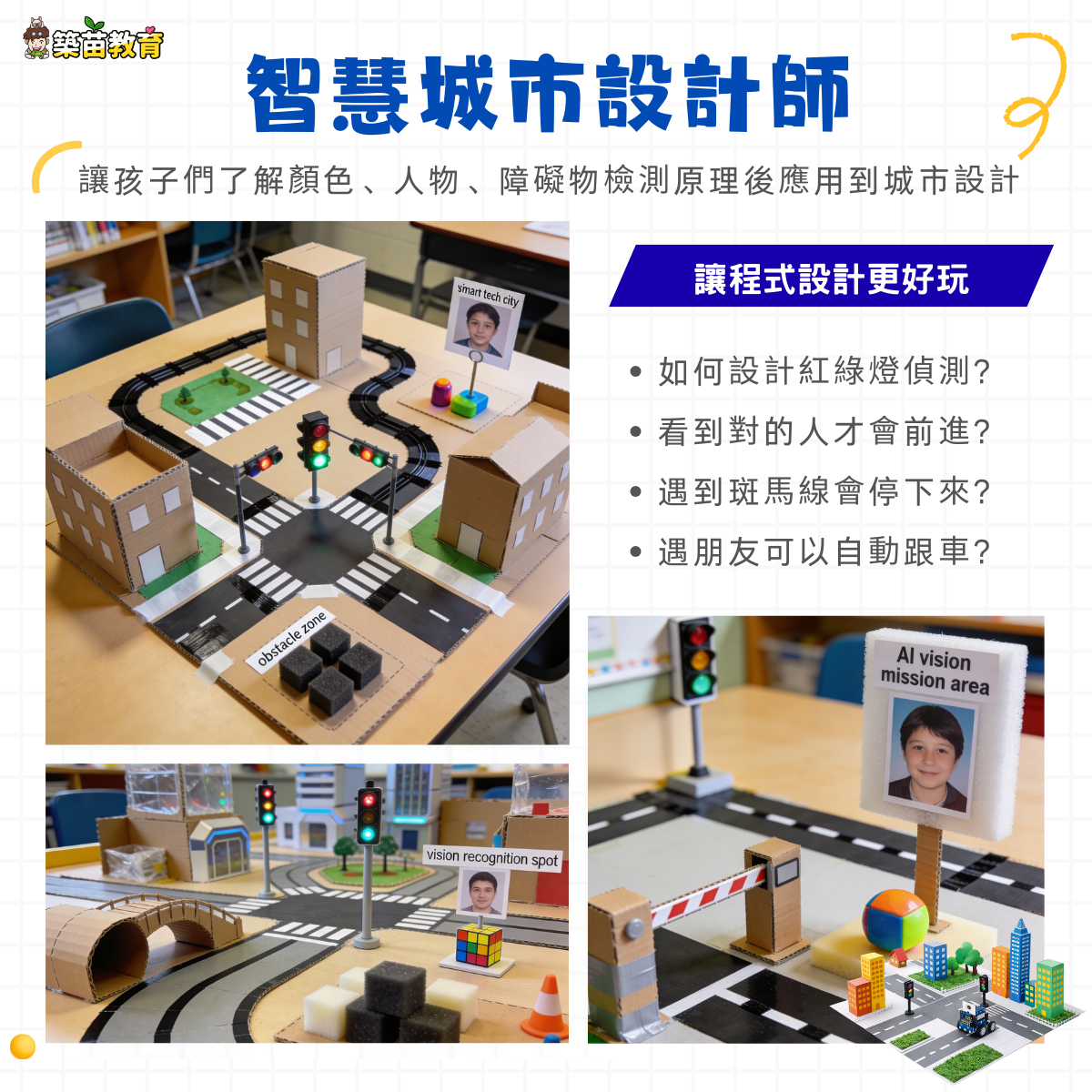 為了維持課程的品質和所有孩子的操作性,基本三人為一小組會一起操作一套無人車設備,同時考量到製作時間與精力,三人會共同協力一起完成一座智慧城市的設計喔!