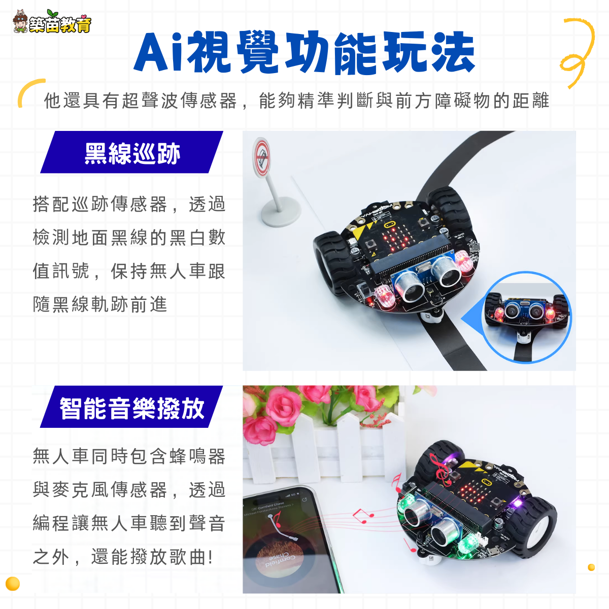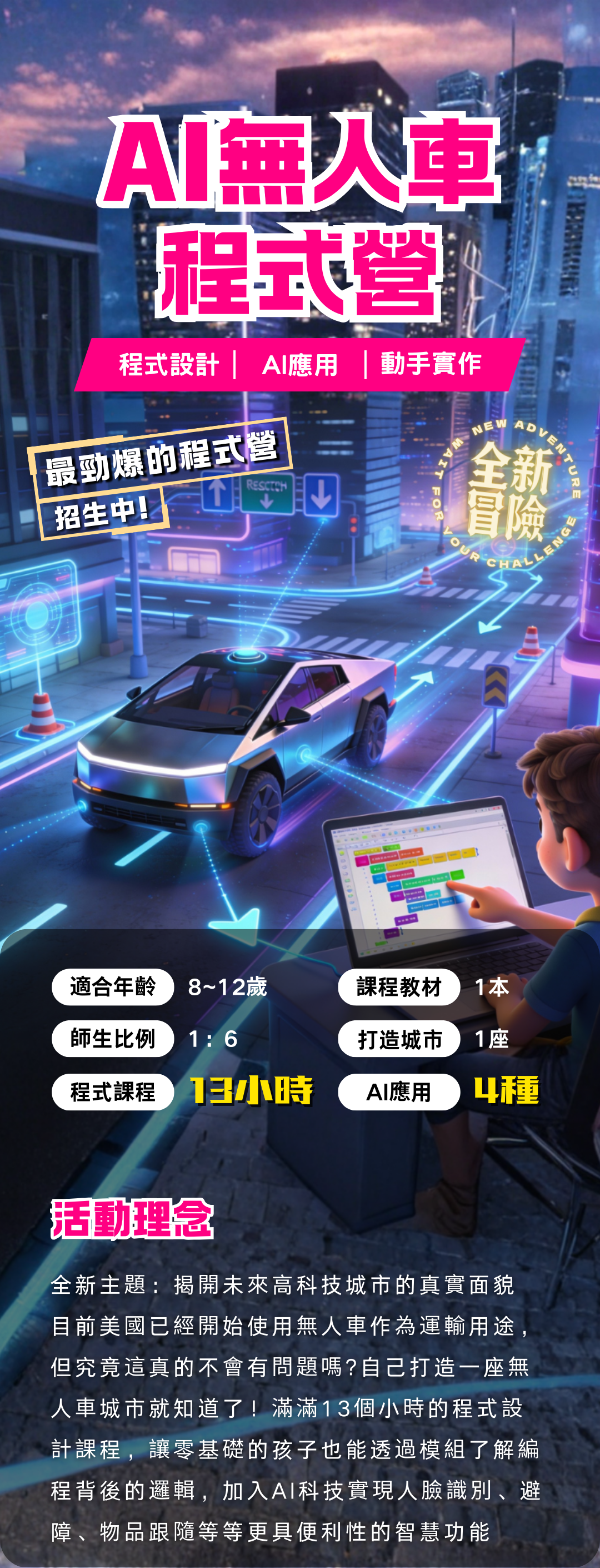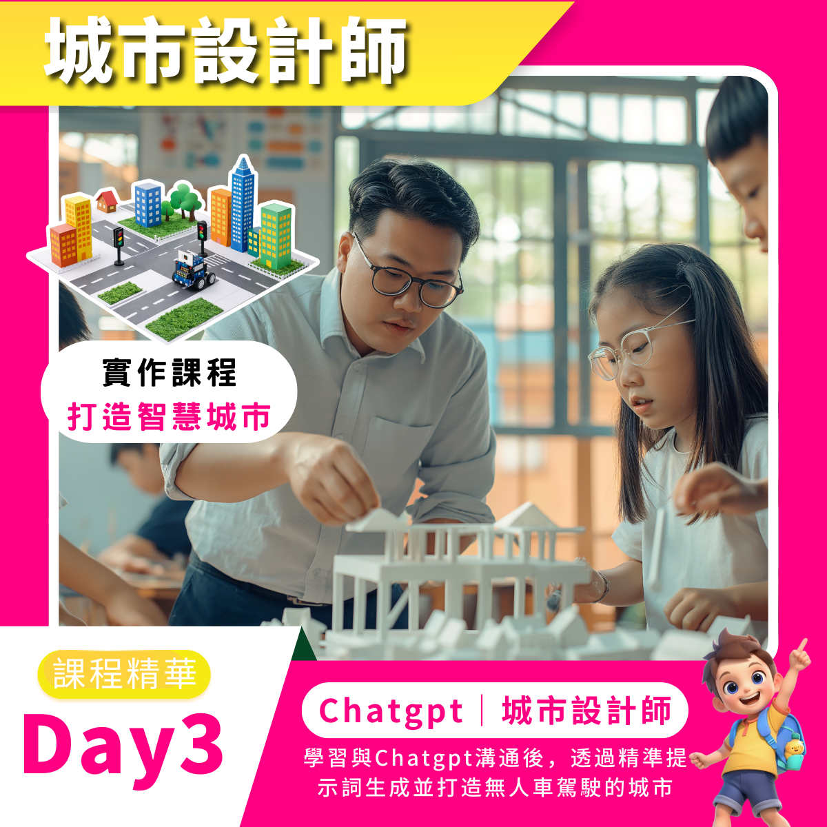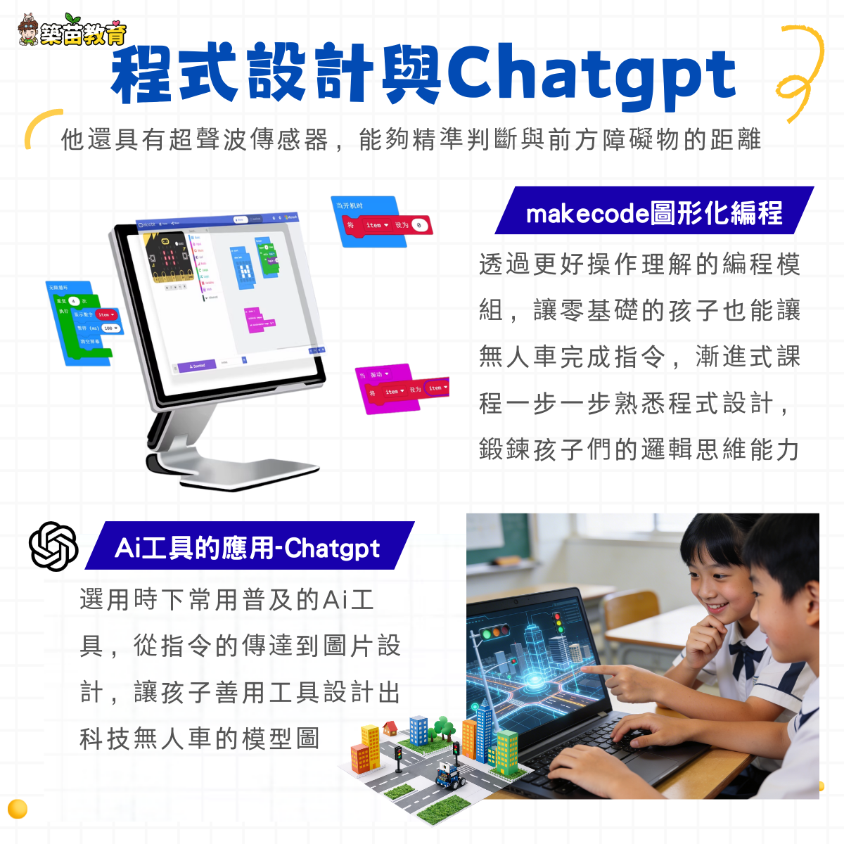 為了維持課程的品質和所有孩子的操作性,基本三人為一小組會一起操作一套無人車設備,同時考量到製作時間與精力,三人會共同協力一起完成一座智慧城市的設計喔!