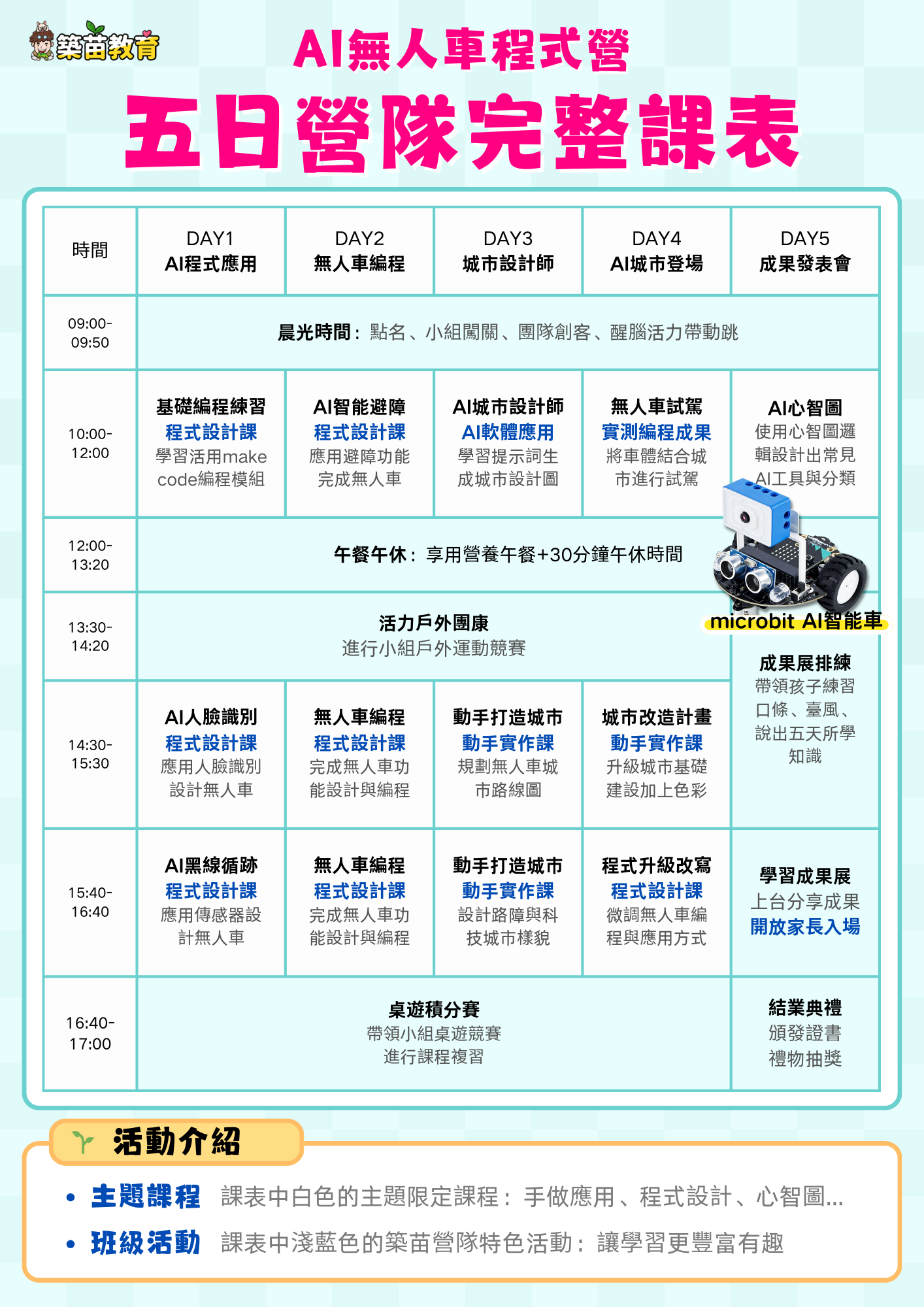 這次我們五天都會帶著孩子學習程式設計,因此會需要孩子自備筆電~若只有文書機也沒關係喔!!一樣能夠配合我們教材進行課程